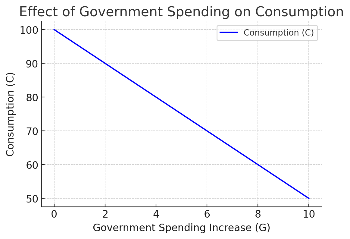 정부지출이 증가할수록 소비가 감소하는 경향을 나타낸다. 이는 구축 효과(Crowding-Out Effect)로 인해 정부지출 증가가 민간 소비를 감소시키기 때문이다.