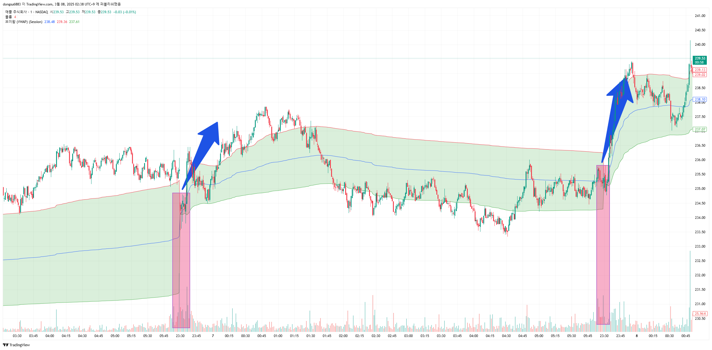 - VWAP 위에서 주가가 유지되면 강세장으로 판단할 수 있으며, 매수 기회로 활용할 수 있다.