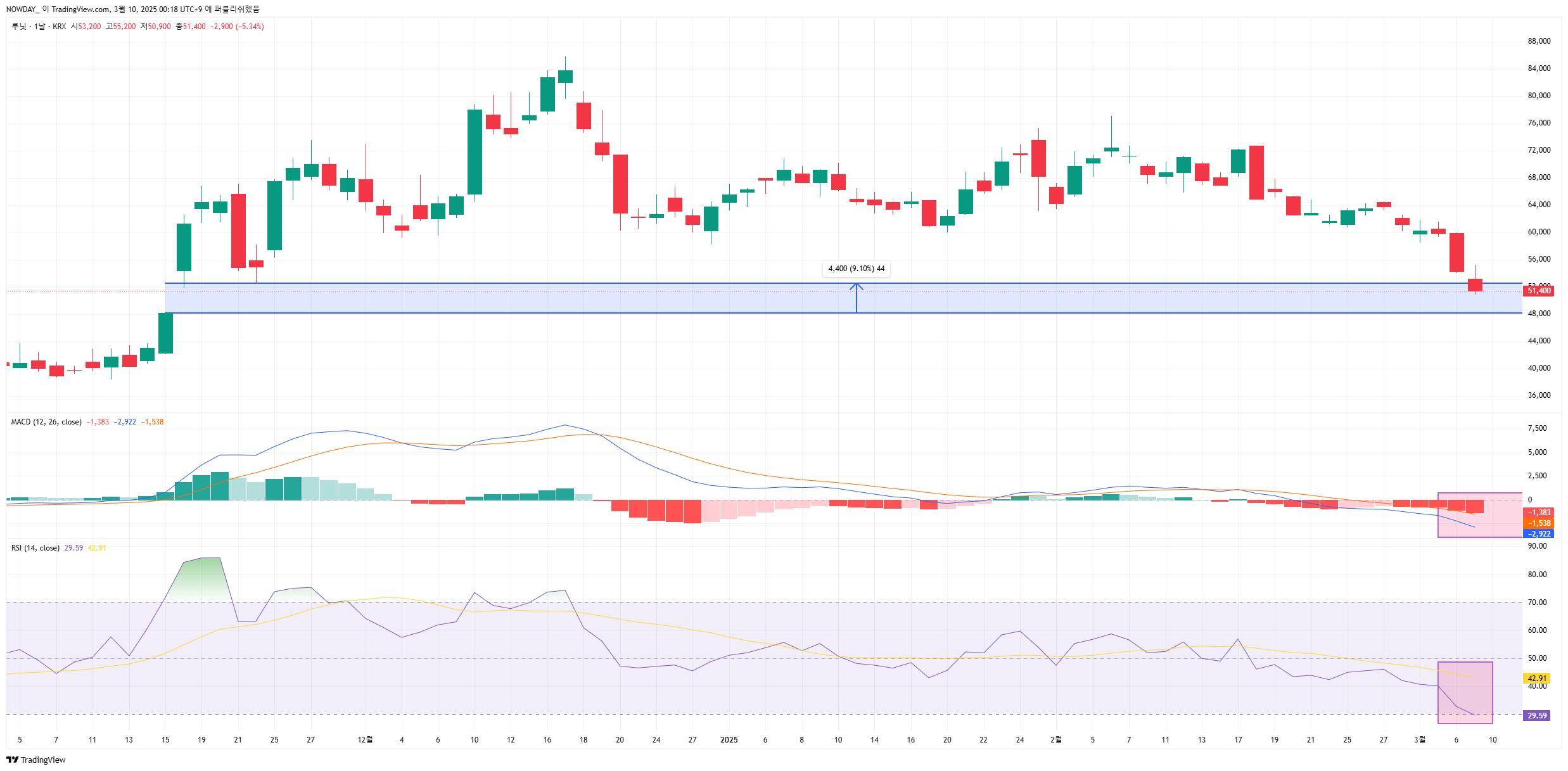 • RSI(상대강도지수) 40~50 → 과매도 영역 접근 → 반등 가능성