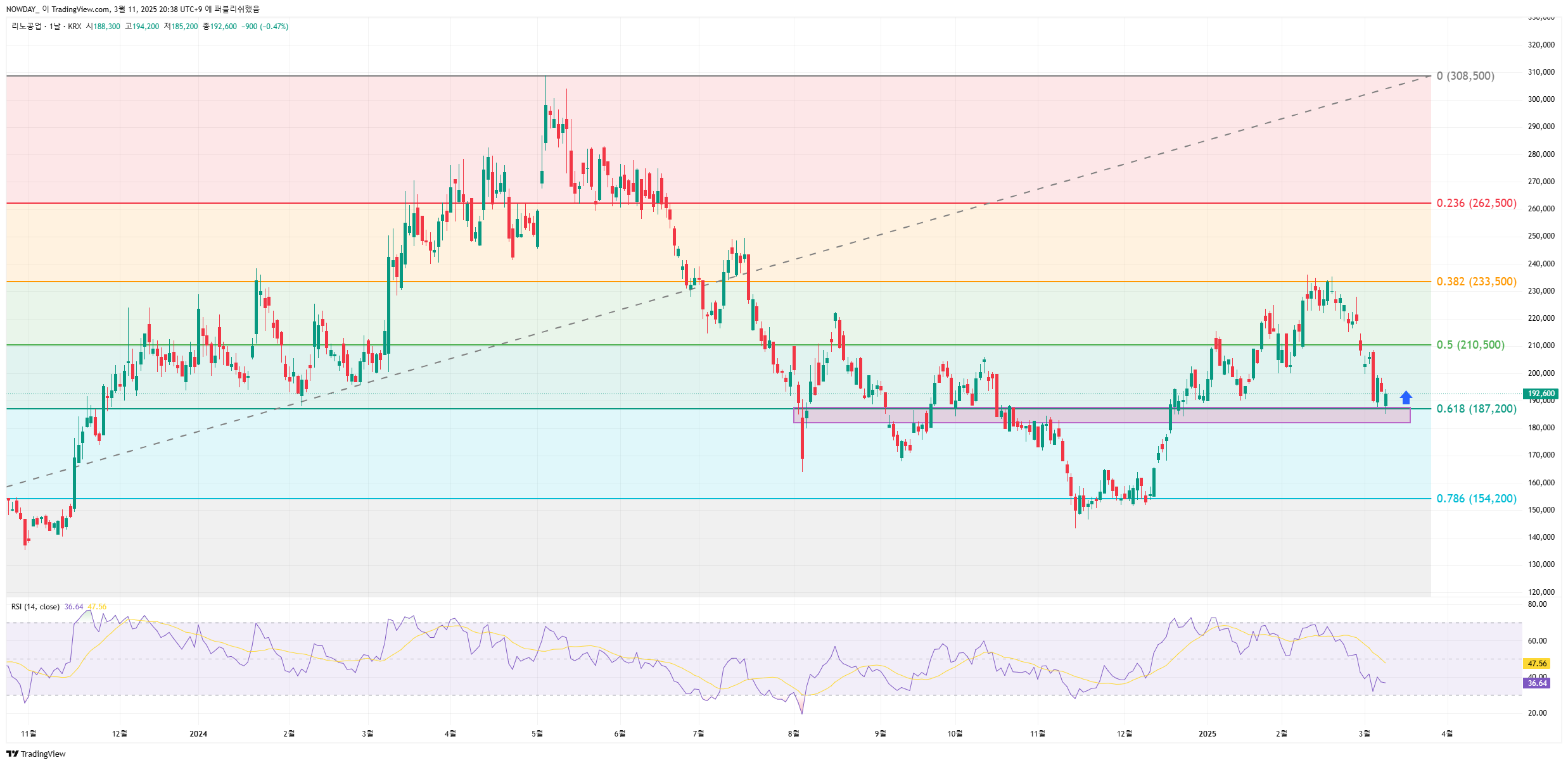 • RSI(36) 비교적 낮음