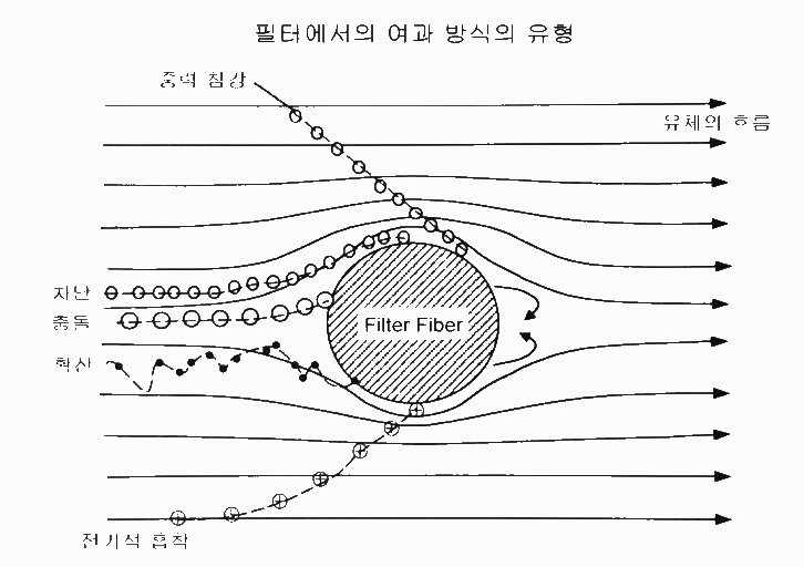 - 기체가 필터 섬유를 통과할 때 무거운 입자는 관성 때문에 직진하려는 성질이 있어 필터 섬유에 충돌하여 제거됨.