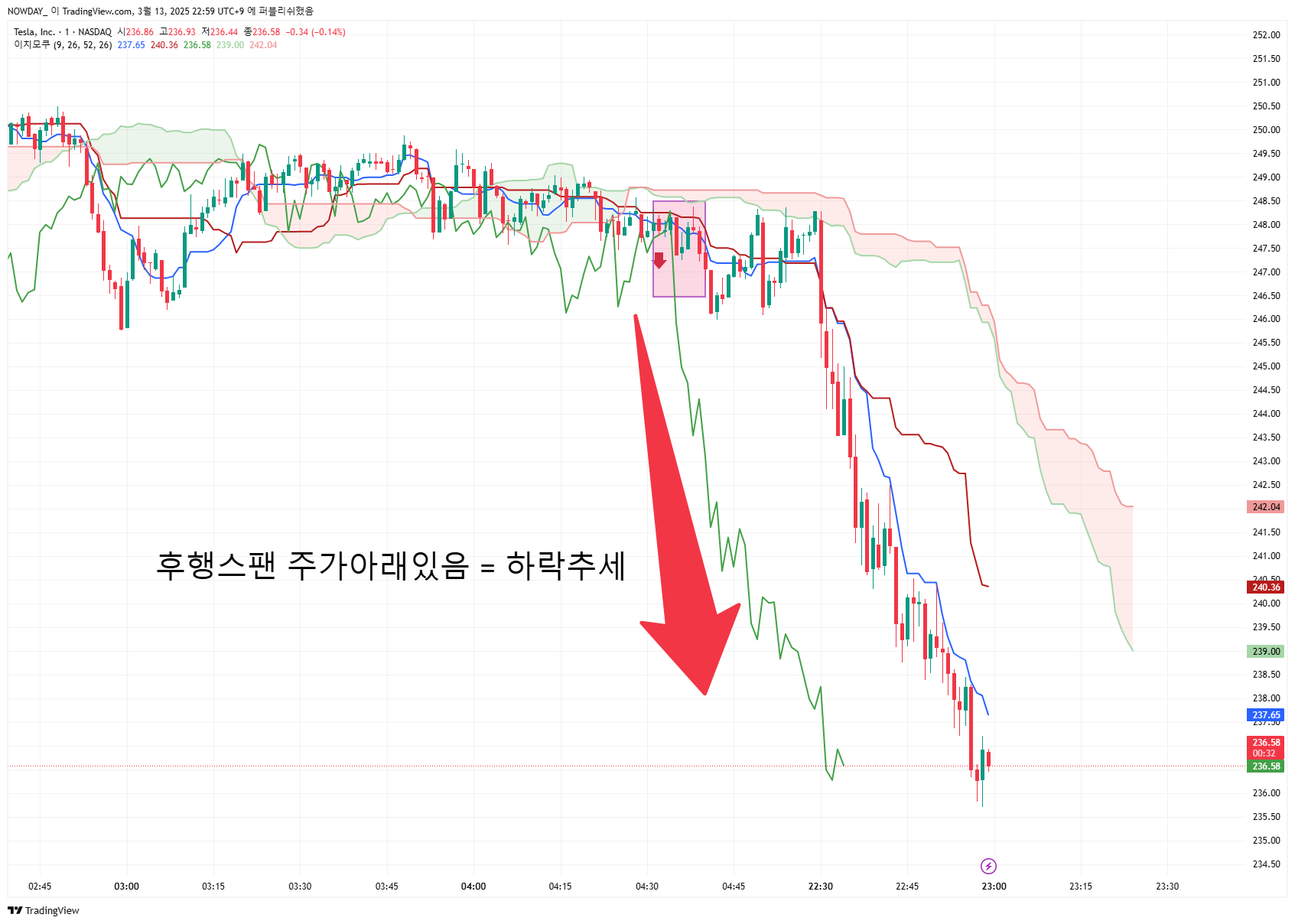 - 후행 스팬이 주가 위에 있으면 상승 추세, 아래 있으면 하락 추세