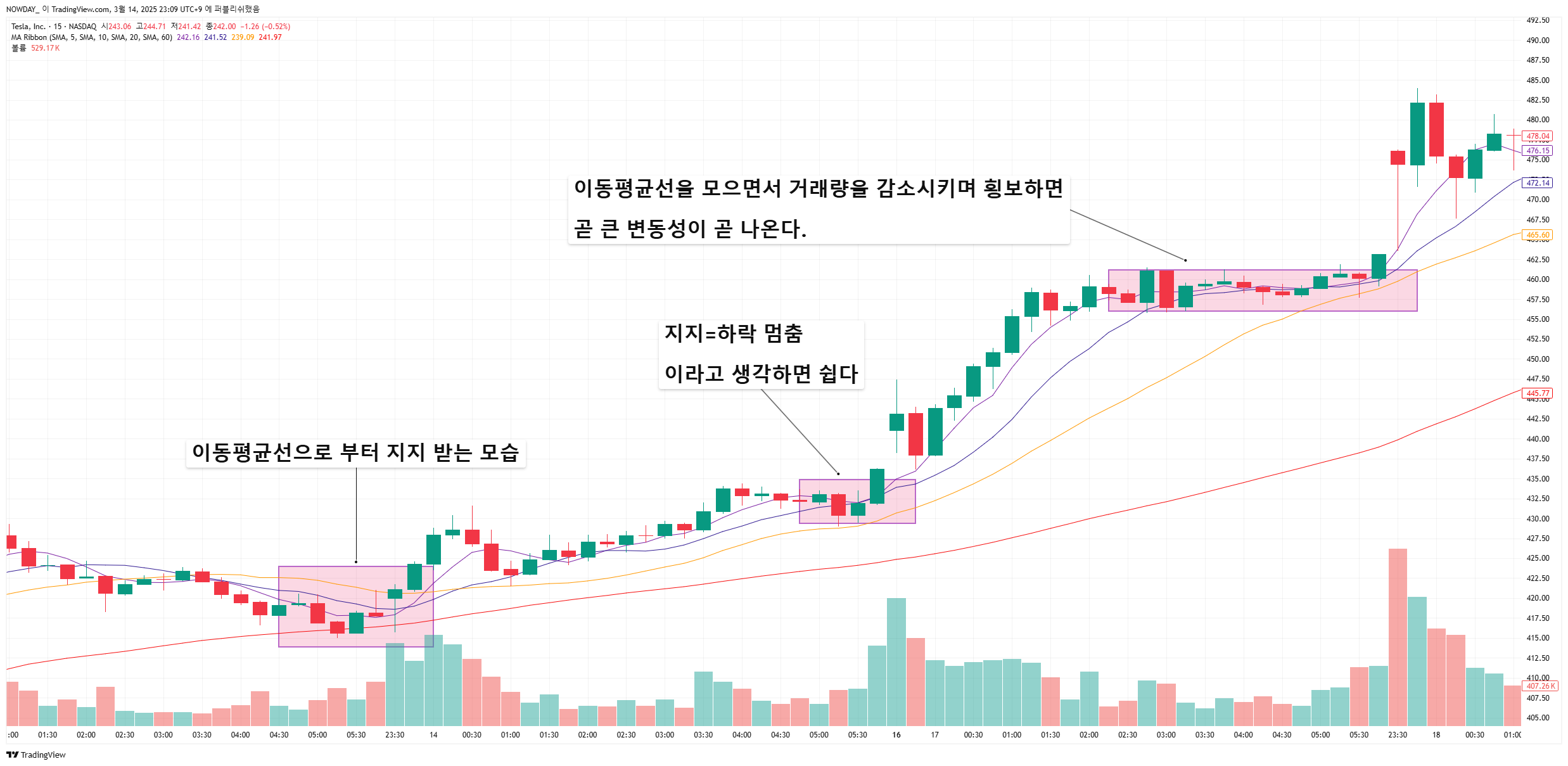 - 20일, 50일, 200일 이동평균선이 지지선 또는 저항선 역할을 하는 경우가 많음.