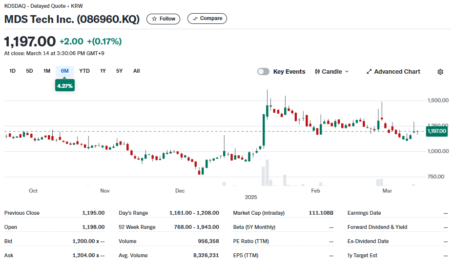 MDS테크의 현재 주가는 1,197원(2025년 3월 기준)으로, 시가총액은 약 1,111억원 수준입니다. 최근 1년간 주가 흐름을 살펴보면, 2024년 하반기부터 상승세를 보이다가 2025년 초 조정을 받은 후 현재는 박스권 흐름을 보이고 있습니다. 이는 전반적인 기술주 시장의 변동성과 함께 회사의 실적 개선 기대감이 혼재된 결과로 볼 수 있습니다.