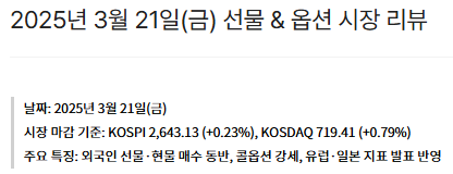 | 2025년 3월 19일(수) 선물 & 옵션 시장 리뷰 (1) | 2025.03.19 |