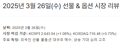 | 2025년 3월 25일(화) 선물 & 옵션 시장 리뷰 (0) | 2025.03.25 |