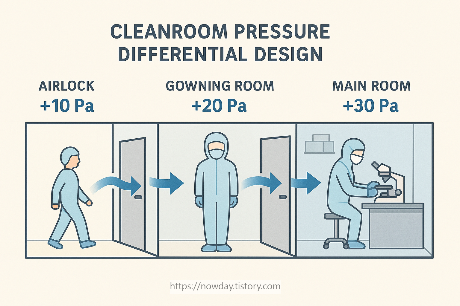 복도(0Pa) → Airlock(+10Pa) → Gowning Room(+20Pa) → Main Room(+30Pa) - 설계 시 고려사항: