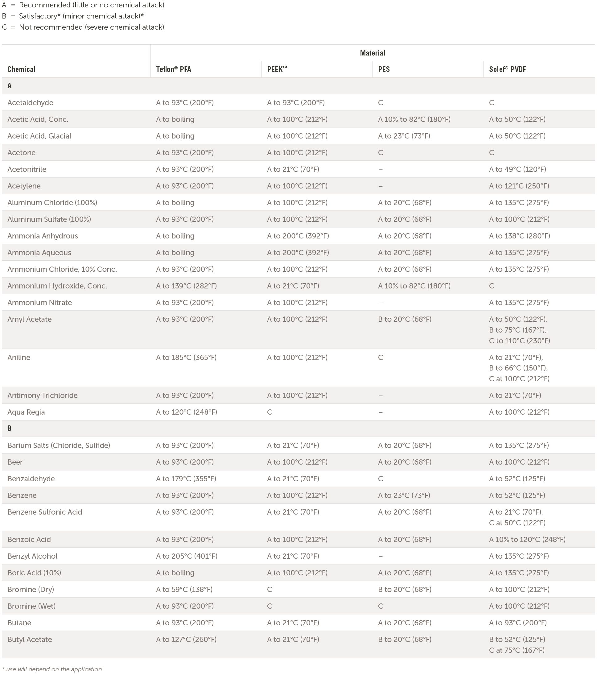 Chemical compatibility chart comparing filter materials (PP, PES, PTFE, PVDF, Nylon) across strong acids, weak acids, weak bases, and strong bases