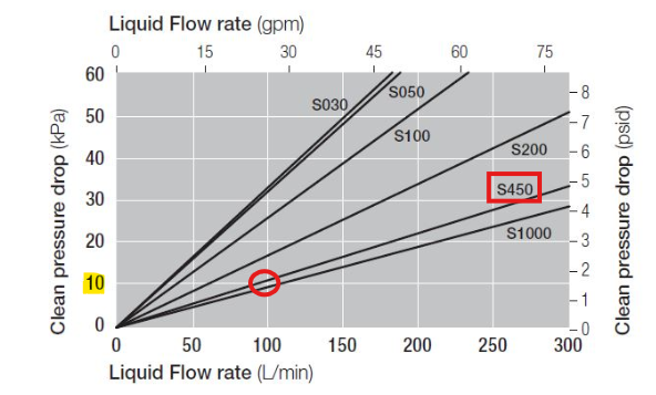 필터 차압/유량표를 확인하는 법은 간단하다. 왼쪽 10kPa(=0.1bar)기준에 내가 원하는 필터 넘버의 유량값을 찾으면된다, 예를 들어 아래 차트에서는 S450이라는 필터의 유량값은 약 100LPM이 된다.