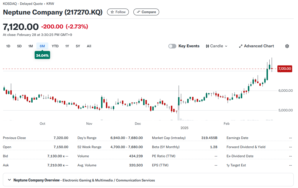 - 최근 주가 흐름: 2025년 2월 기준 넵튠 주가는 7,120원 수준으로, 1년 전 대비 약 30% 상승 (중국 판호 관련)